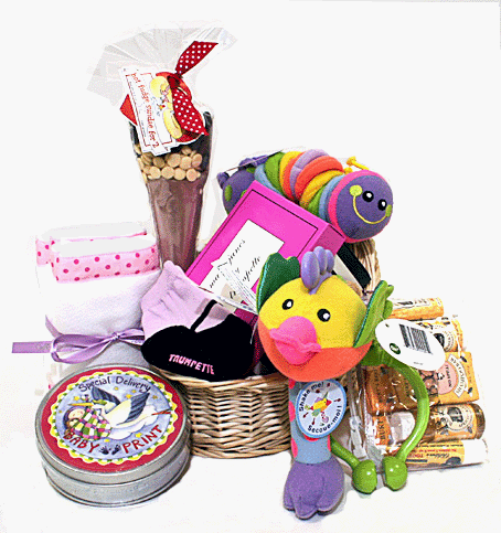 - The DELUXE INCLUDES: Mom and Dad get treats as well!! Our Delicious Hot Fudge Sundae Mix for 2: Cone filled with hot fudge mix, imported white and semi-sweet chocolate chips and mini marshmallows. Enough mix for special friends to enjoy together to celebrate any occasion especially the birth of a new baby! AND The Crazy Daisy Squeaking Wiggler that makes fun noises when shaken or pulled on. It can be attached to the crib or stroller as well.
